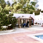 En la parte trasera de la propiedad hay un amplio patio con barbacoa y hay dos trasteros exteriores para leña y herramientas de jardinería. En la parte delantera de la propiedad hay una pérgola de madera con sombra y un porche que conduce a la entrada de la propiedad.